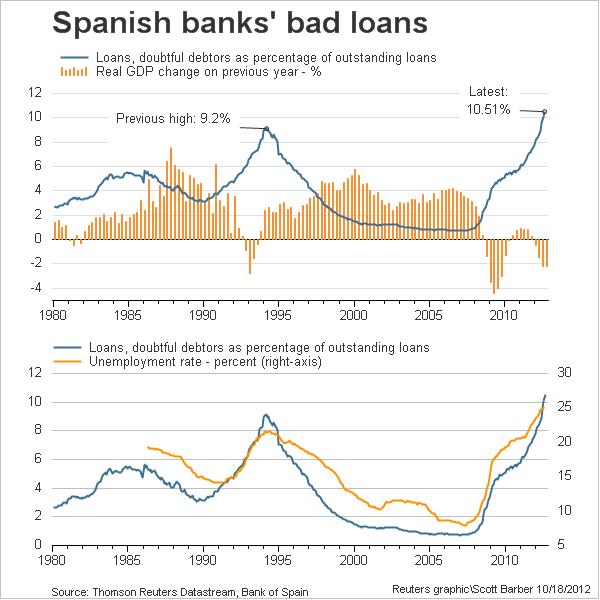 Spain is setting up a bad bank to siphon property assets off lenders’ balance sheets and banks are preparing to receive the first funds from a 100-billion-euro credit line agreed with the European Union. But the record loan data raises the question of whether consumer loans should also be transferred to the bad bank and if Spain will take too little of the European cash. The government estimates it only needs 40 billion euros.